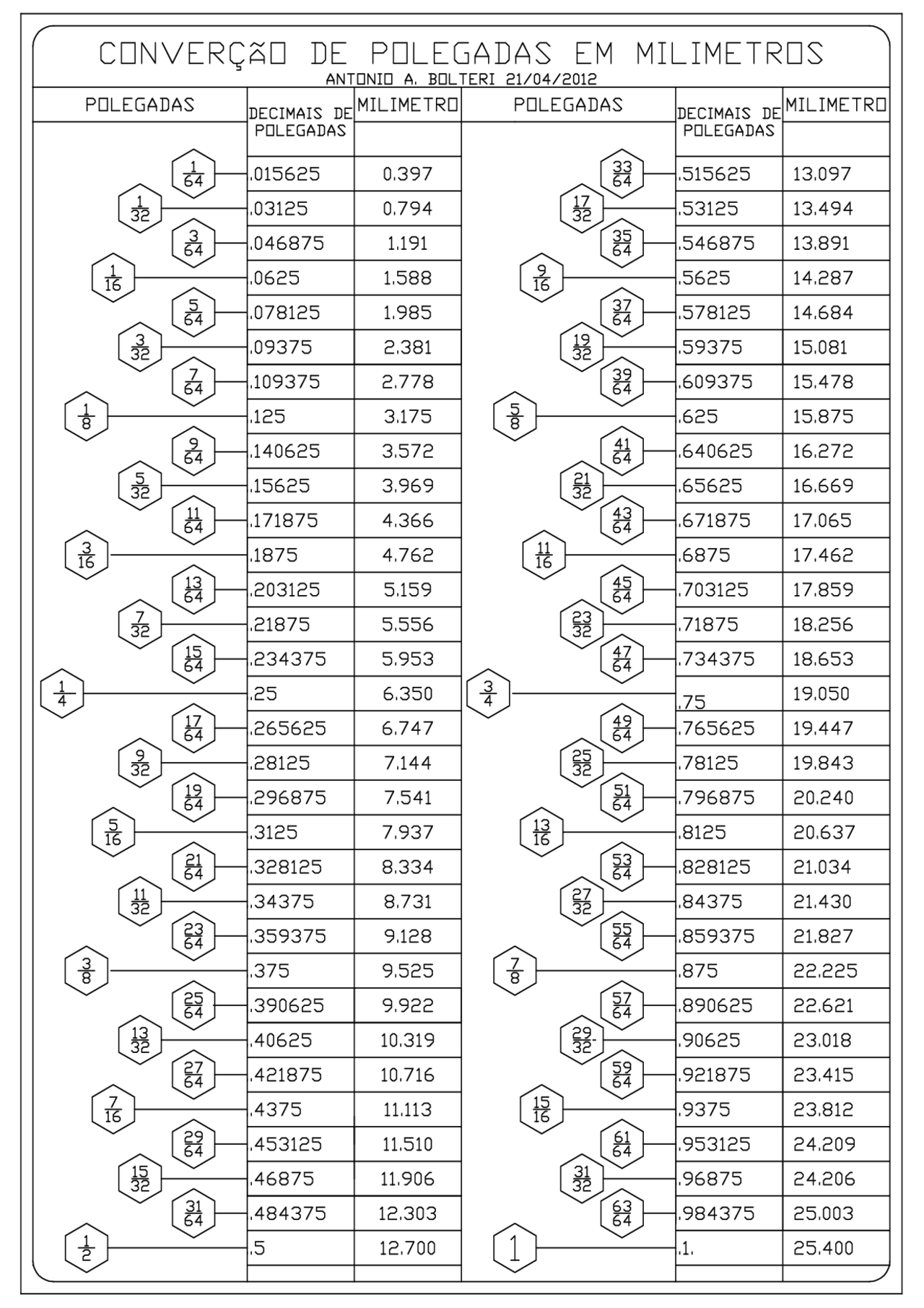 Tabela de conversão de polegadas para milímetros com frações Fábio Ardito