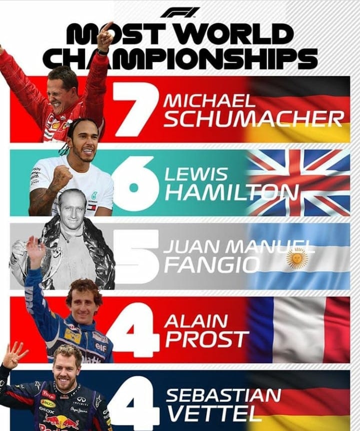 No total, existem apenas 34 campeões de F1 que ganharam um título de campeonato de pilotos de F1. Desses 34 pilotos, 47% ganharam dois ou mais campeonatos, de fato, uma quantidade louca de 16 pilotos ganhou mais de um título. No topo desses 16 pilotos estão Michael Schumacher e Lewis Hamilton, que conquistaram incríveis sete títulos.