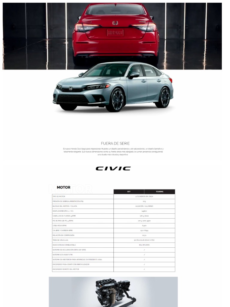 Ficha-Tecnica-CIVIC. 2016. CARACTERÍSTICAS DE INGENIERÍA. EX. TURBO. TURBO PLUS. Motor de Aleación de Aluminio. 4 Cilindros en Línea 2.0 Litros de 16 válvulas DOHC i-VTEC Potencia neta: 158 hp @ 6500 rpm* Torque neto: 138 lb/pie @ 4200 rpm*.