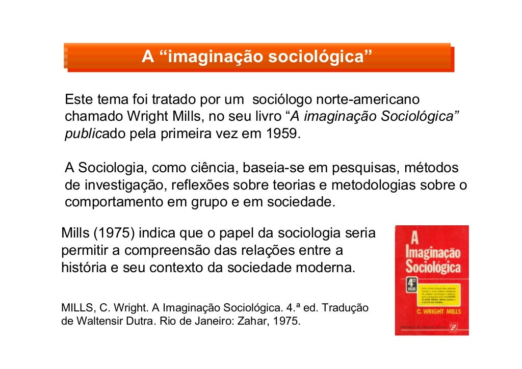 O trabalho sociológico depende do que o autor americano Wright Mills, em uma célebre expressão, denominou de imaginação sociológica (Mills, 1970). A imaginação sociológica nos pede, sobre tudo, que sejamos capazes de pensar nos distanciando das rotinas familiares de nossas vidas cotidianas para poder vê-las como se fosse algo novo.