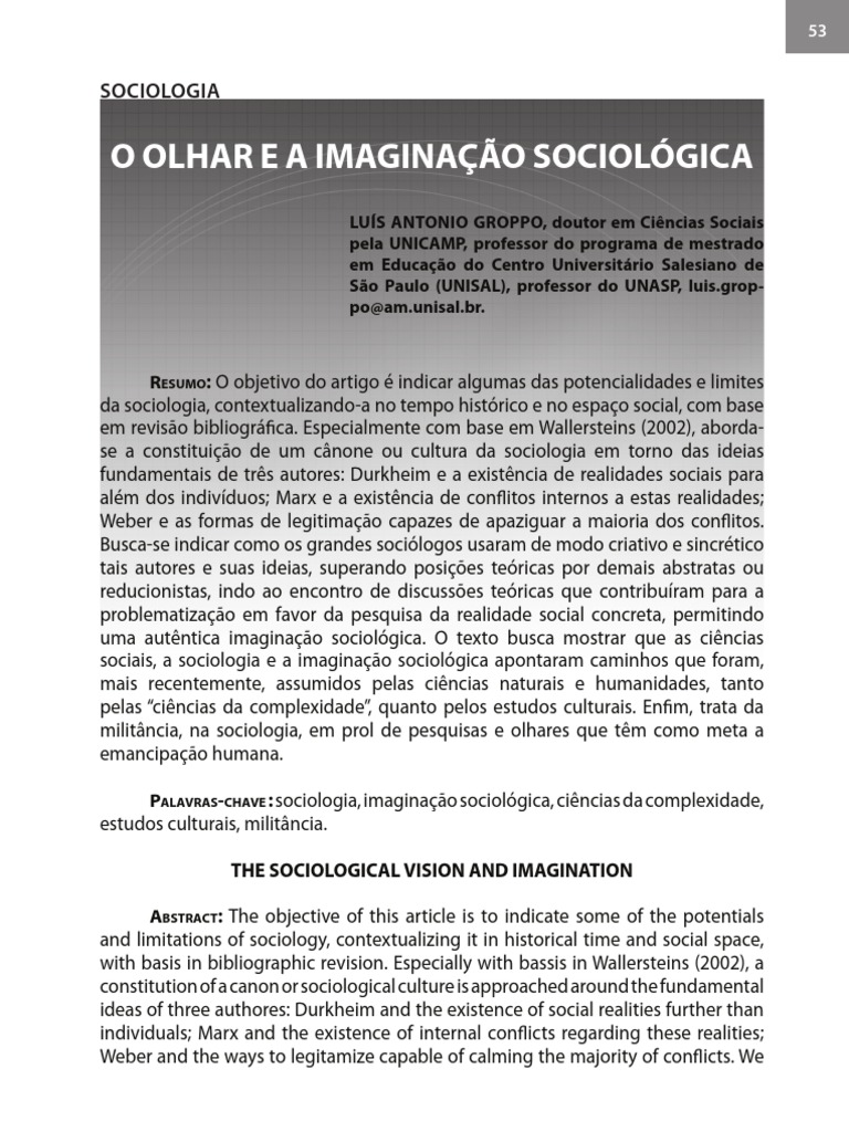 A imaginação sociológica e questões críticas em C. Wright Mills: pontos de referência ao papel do educador. RESUMO. O que se vem chamando de "pós-modernidade" reflete, na essência de suas crises, o profundo caráter de resistência oferecida à necessidade de mudanças profundas nas atitudes, na percepção e na visão de mundo das.