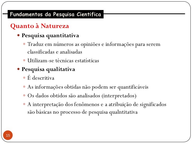 Quantitativa: método que recorre a diferentes técnicas estatísticas para quantificar opiniões e informações. Qualitativa: é um método descritivo que explora os detalhes da pesquisa e a vivência do próprio entrevistado ou pesquisador. Saiba mais sobre a pesquisa quantitativa e pesquisa qualitativa.. Já em relação aos objetivos pretendidos, a pesquisa se classifica em: