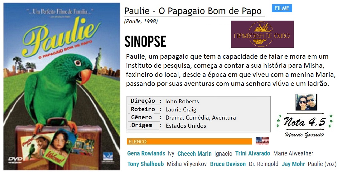 Paulie, o Papagaio Bom de Papo: Dirigido por John Roberts. Com Gena Rowlands, Tony Shalhoub, Cheech Marin, Bruce Davison. A talking parrot named Paulie recounts his travels to look for his original owner to a Russian janitor who helps him to the end of his journey.