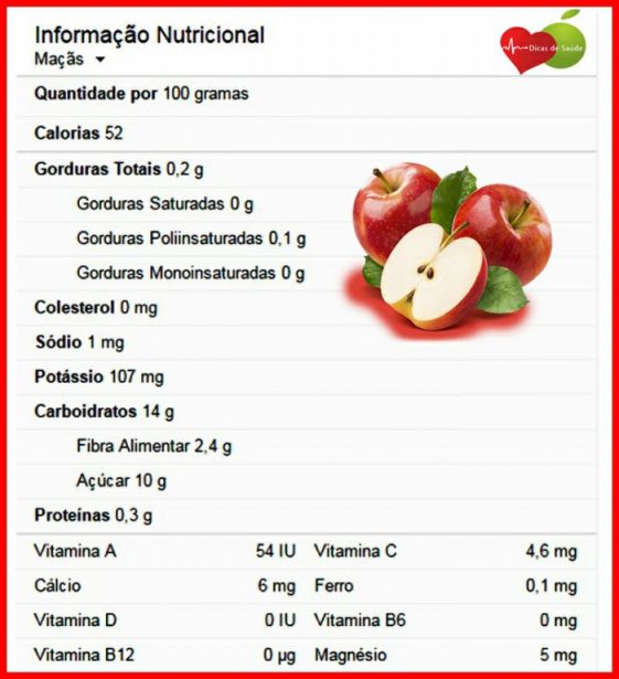 12 mar Valor Nutricional da Maçã. A maçã brasileira contém elevadas concentrações de fibras solúveis que auxiliam no funcionamento gastrointestinal, e é rica em vitaminas do complexo B, C e E. Essas características tornam a fruta um excelente "agente" anti-inflamatório, anti-hemorrágico e antialérgico. Além de não conter.