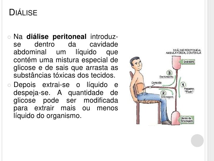 Hemodiálise: Bombeia o sangue através de uma máquina e um dialisador, para remover as toxinas do organismo. O sangue é limpo na máquina e devolvido ao corpo. Todo processo dura cerca de 4 horas e deve ser feito em média três vezes por semana, em uma clínica ou hospital especializados. Diálise Peritoneal: Por meio da colocação de um.