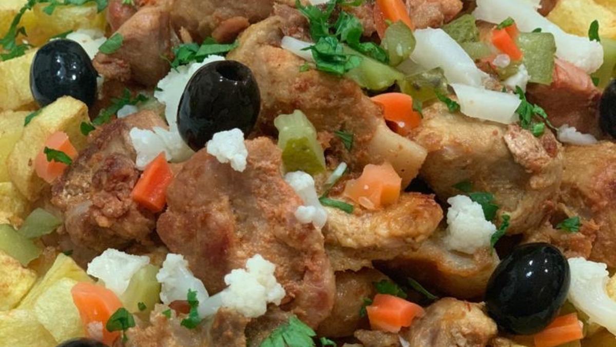 Preparação. Depois da carne estar limpa de gorduras e cortada em cubos tempere-a com a massa de pimentão, os alhos picados, o vinho branco, o louro, a pimenta e um pouco de sal. Deixe repousar. (Deixei a tarde toda) Entretanto descasque as batatas e corte-as em cubos pequenos. Escorra-as e seque-as, fritando depois em óleo bem quente até.