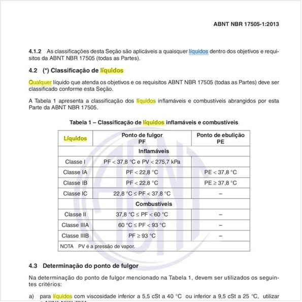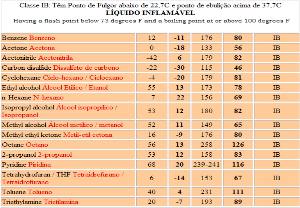 20.2.1.1 Quando o líquido inflamável tem o ponto de fulgor abaixo de 37,7ºC (trinta e sete graus e sete décimos de graus centígrados), ele se classifica como líquido combustível de Classe I. 20.2.1.2. Quando o líquido inflamável tem o ponto de fulgor superior a 37.7ºC (trinta e sete graus e
