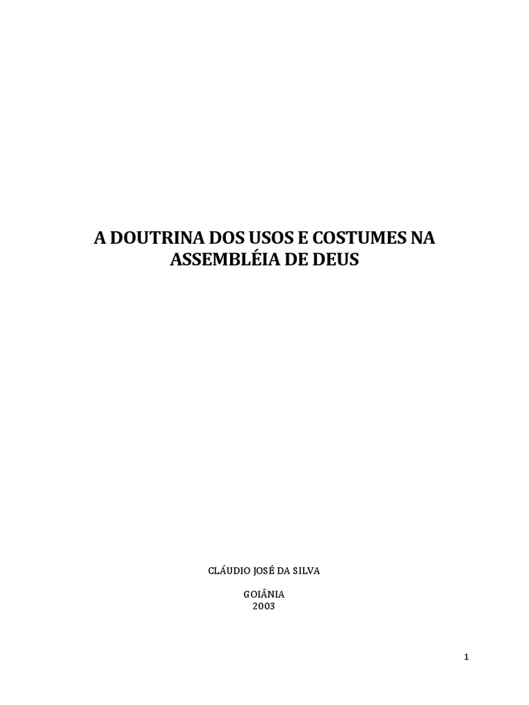 A Doutrina dos Usos e Costumes da Assembléia de Deus. Universidade Católica de Goiás: Goiânia,2003. Neste trabalho, procurou-se investigar as mudanças que a Assembléia de Deus tem enfrentado hoje na Doutrina dos usos e costumes. Partiu-se da hipótese de que os Usos e Costumes sempre foram regras de conduta dos crentes da Assembléia de